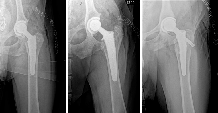 These are nice examples of Biomedtrix BFX cementless femoral stems. From left, the original tapered stem design to the newer, augmented collared (middle image) and lateral bolt (right) femoral stems.
